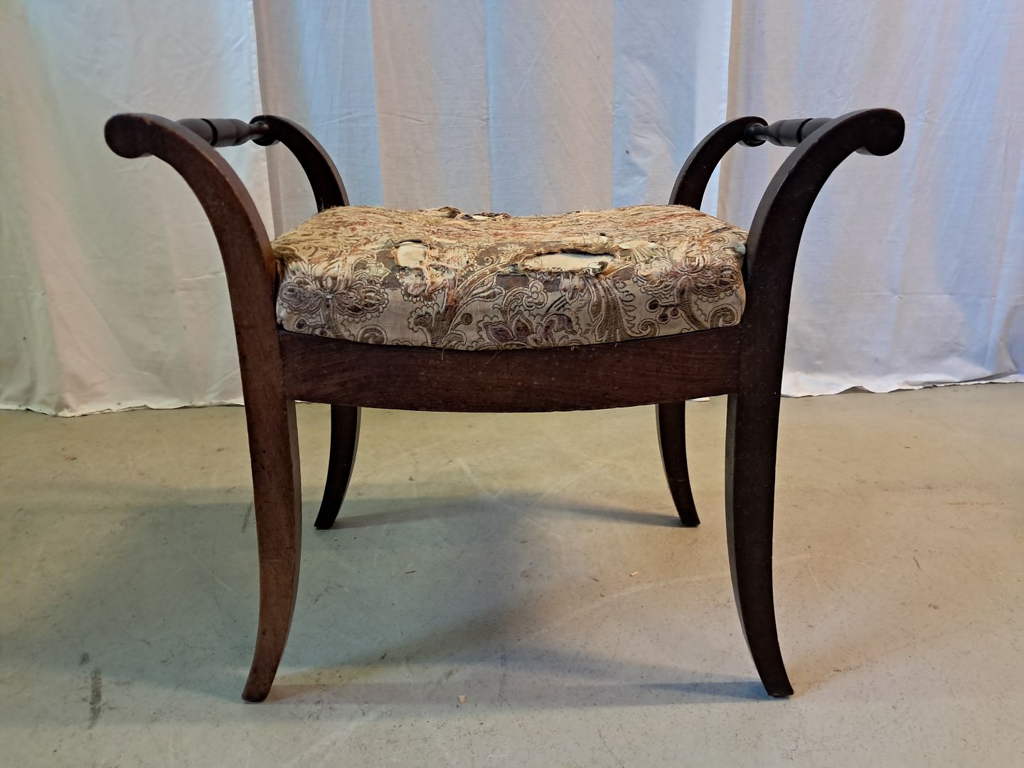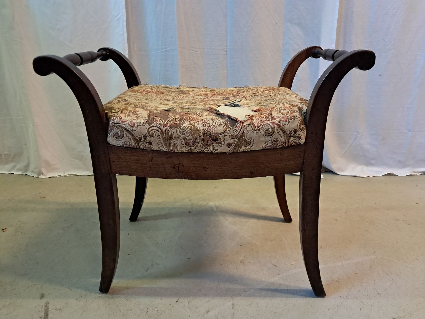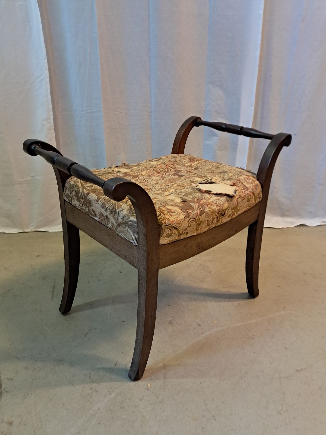 Klaverskammel i massivt mahogni, fra 1910erne. Den har defekt betræk. Højde 58cm Bredde 67cm Dybde 40cm Sædehøjde 45cm Emne nummer: 77302