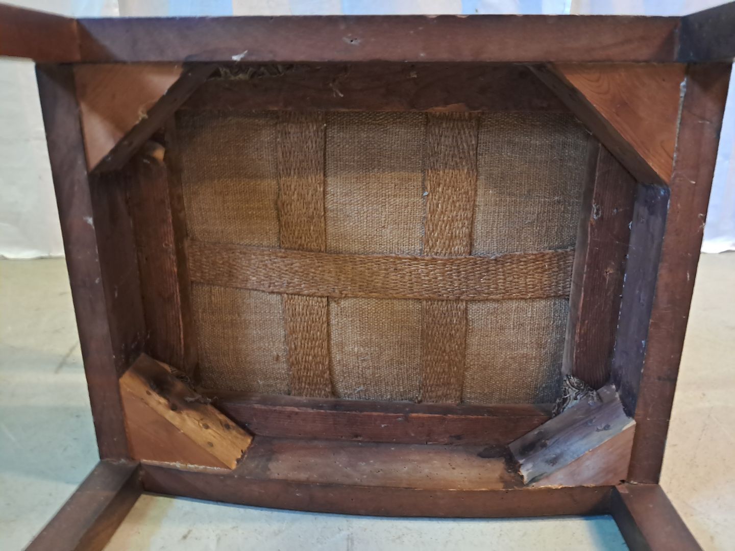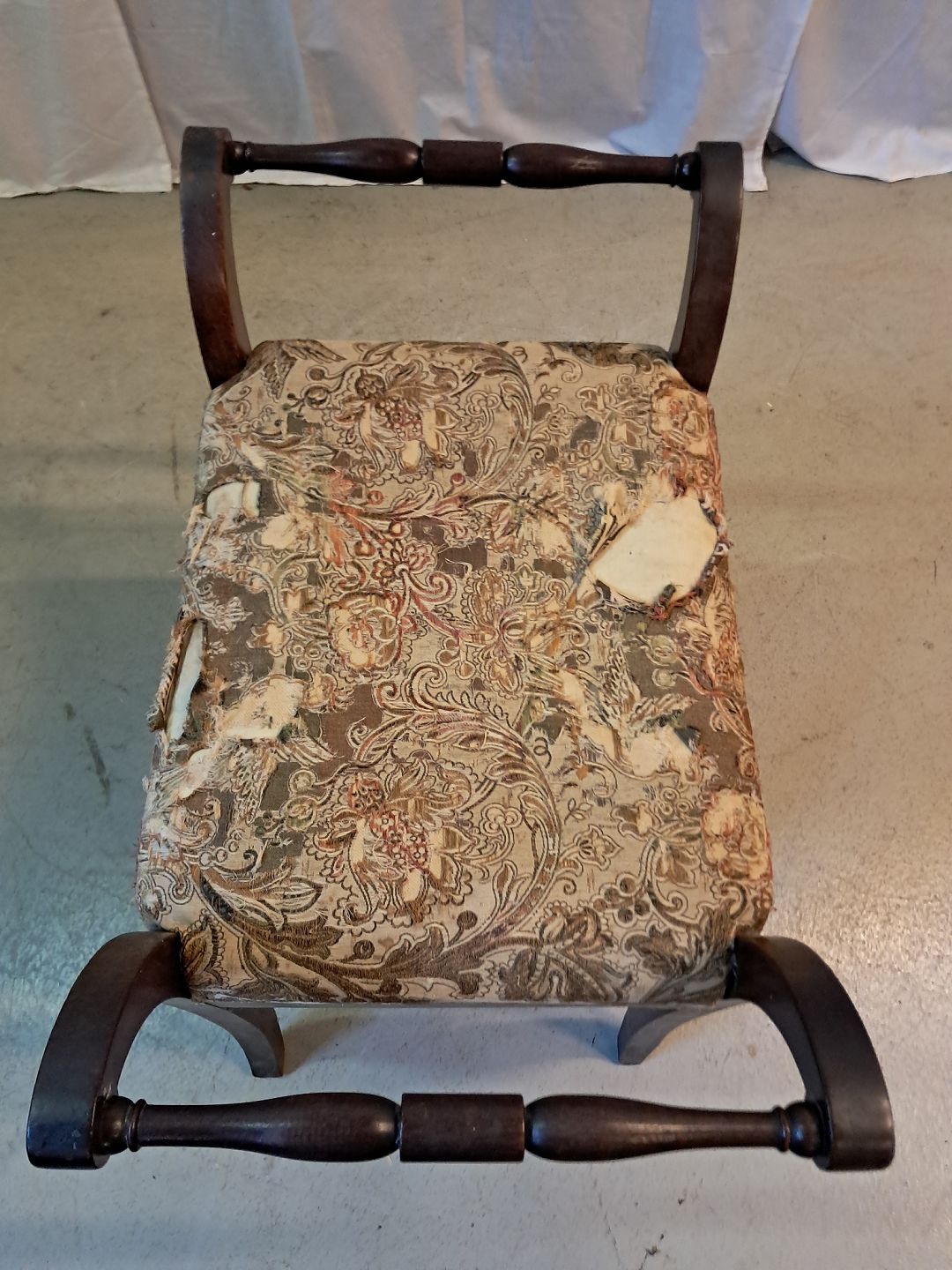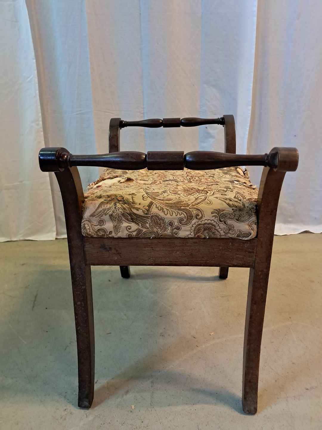 Klaverskammel i massivt mahogni, fra 1910erne. Den har defekt betræk. Højde 58cm Bredde 67cm Dybde 40cm Sædehøjde 45cm Emne nummer: 77302