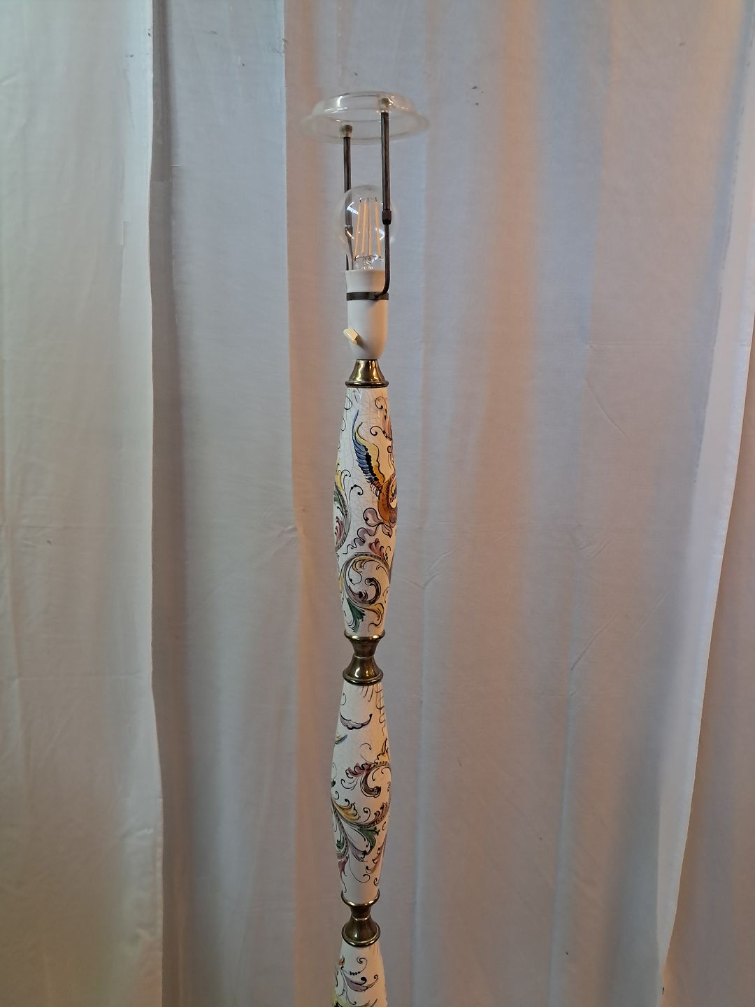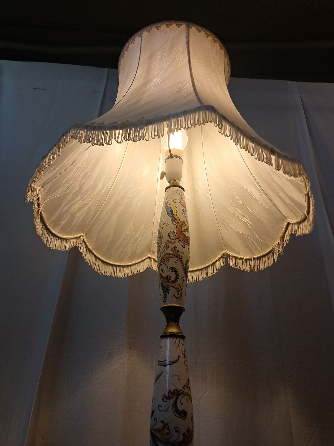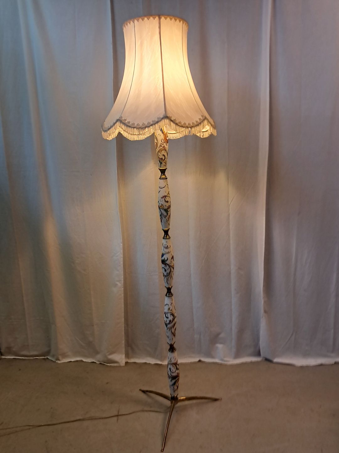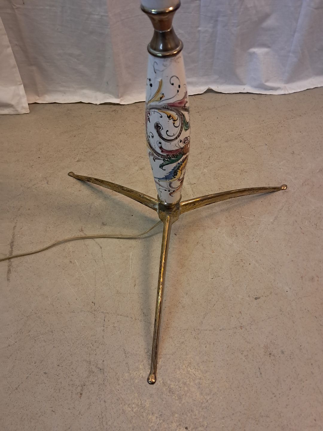 Gulvlampe i metal og pocelæn med skærm, fra 1980erne. Den har brugsspor. Højde 183cm Diameter på fod 30cm Diameter på skærm 46cm Emne nummer: 77313