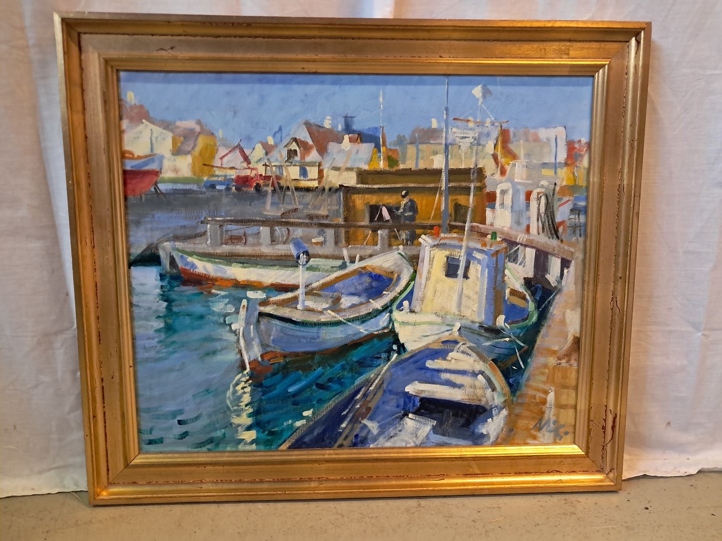 Maleri af Dragør havn i guldmalet ramme, af : Mogens Amdi Thorsen (1924-2016) Det har brugsspor. Højde 60cm Bredde 71cm Emne nummer: 77327