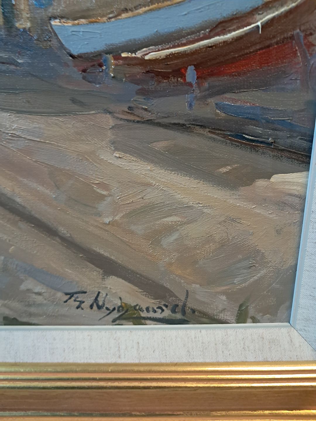 Maleri af Dragør Havn i guldmalet ramme, af : Th. Nygaard Det har brugsspor. Højde 80cm Bredde 94cm Emne nummer: 77333