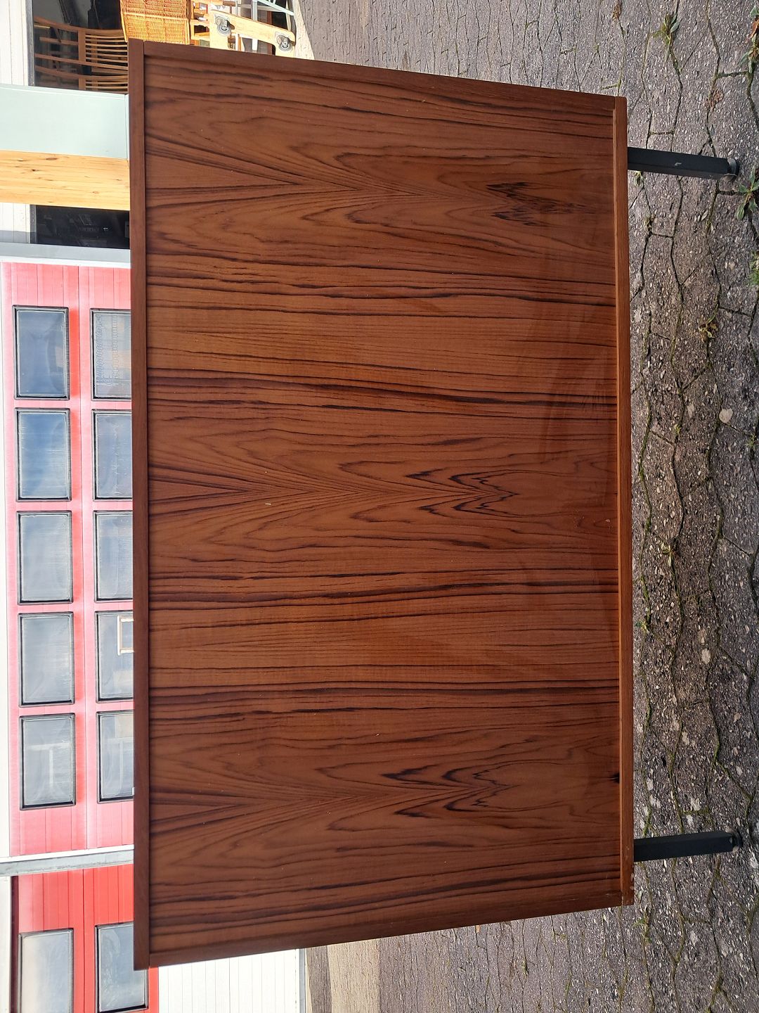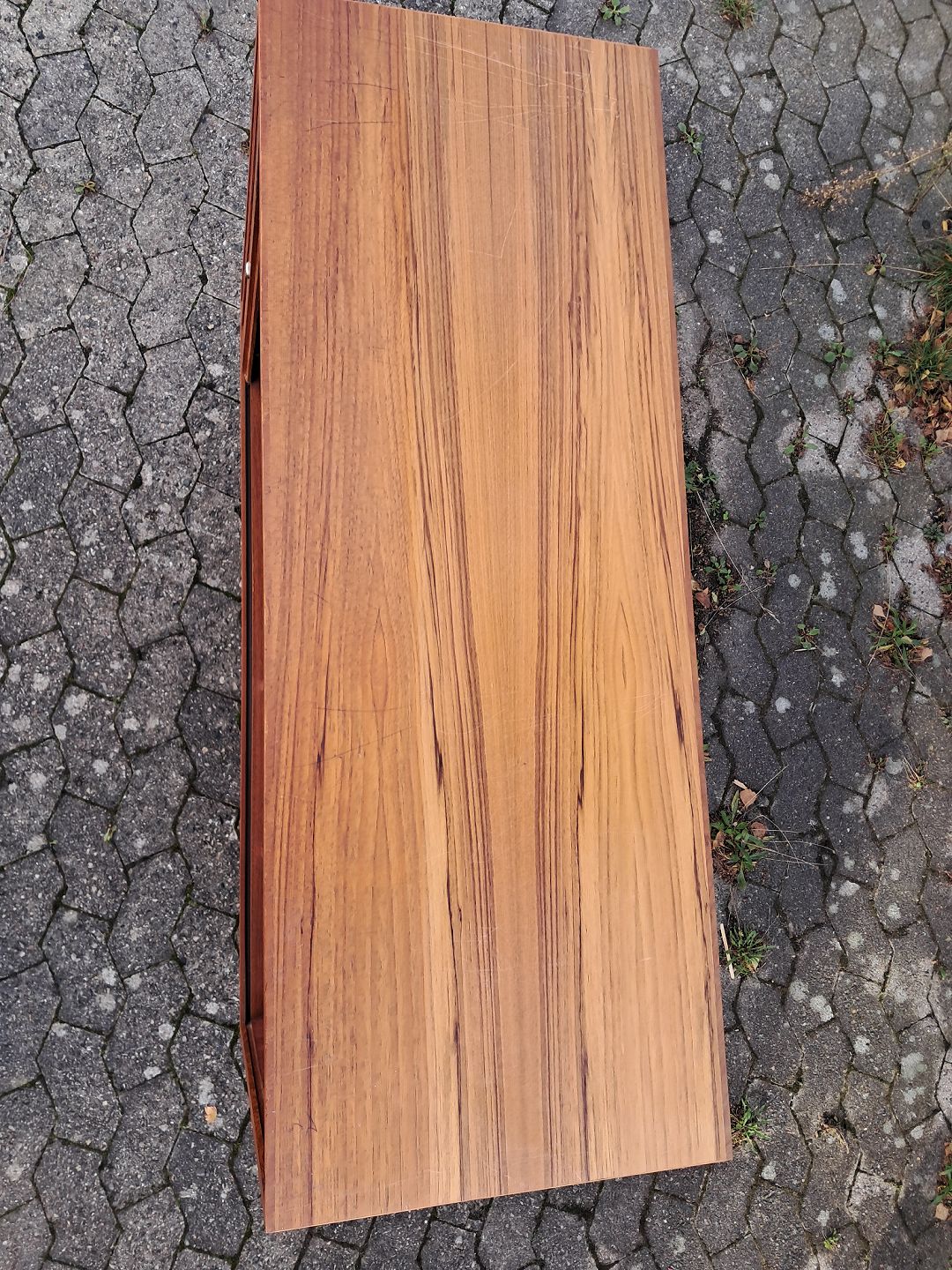 Jalousi skab i fineret teaktræ, fra 1970erne. Det har brugsspor og der medfølger ikke nøgle. Højde 93cm Bredde 120cm Dybde 43cm Emne nummer: 77340