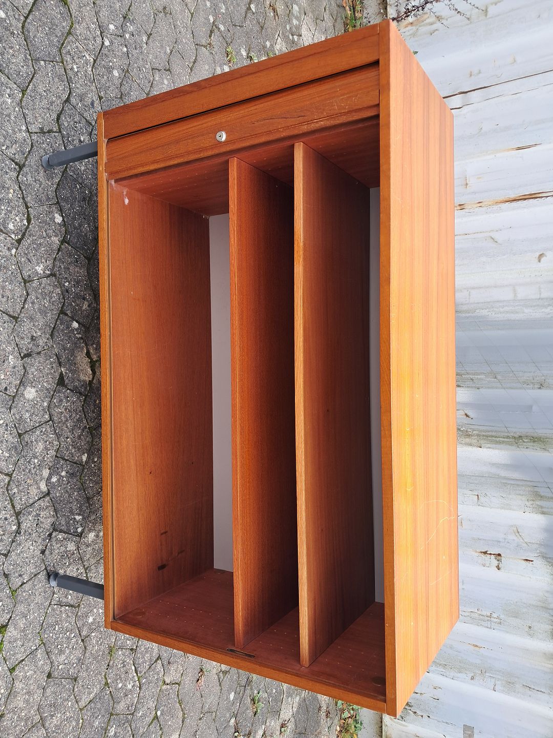 Jalousi skab i fineret teaktræ, fra 1970erne. Det har brugsspor og der medfølger ikke nøgle. Højde 93cm Bredde 120cm Dybde 43cm Emne nummer: 77345