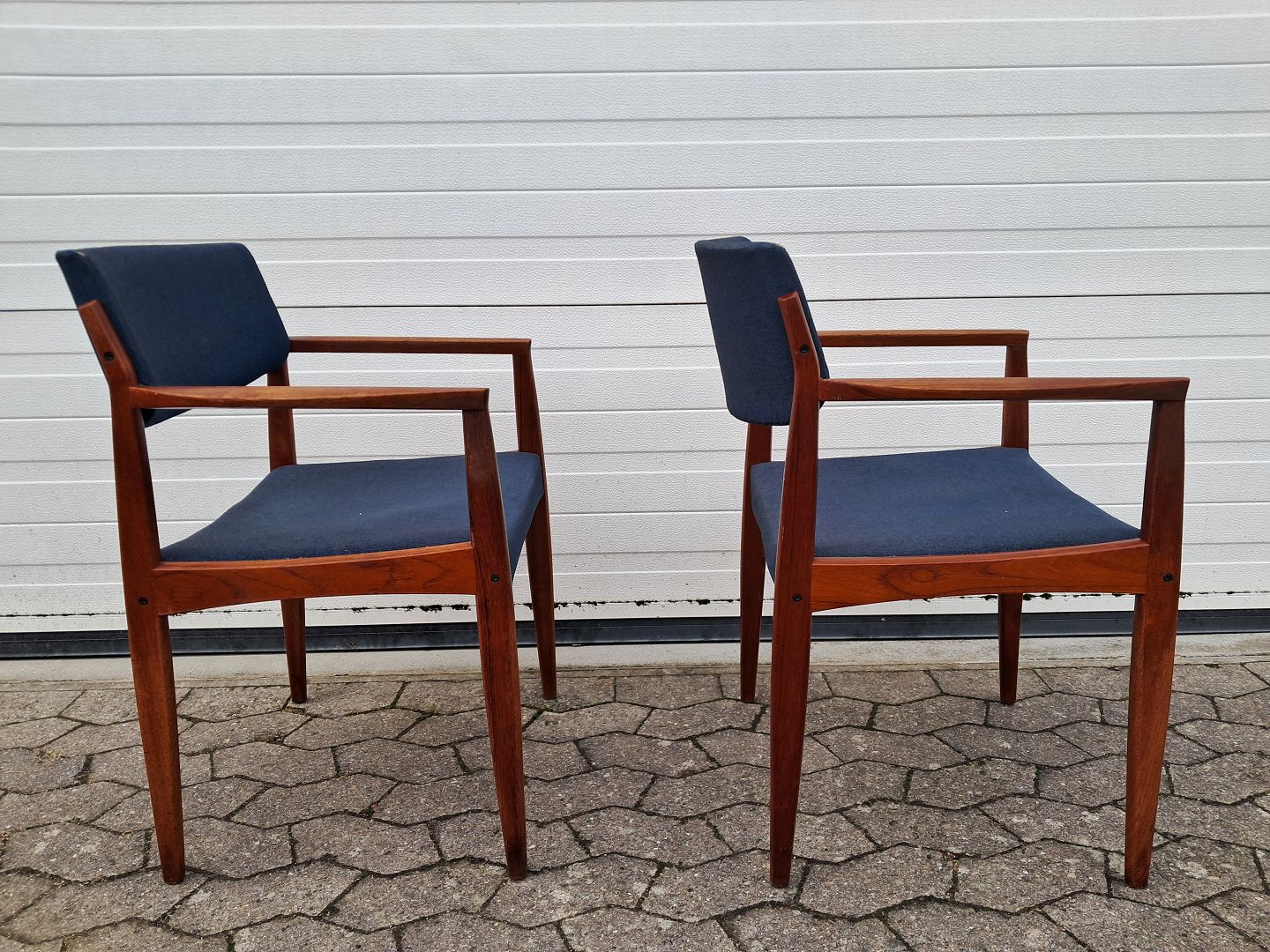 2 Armstole i massivt teaktræ, fra 1960erne. De har brugsspor og defekt betræk. Ryghøjde 78cm Sædehøjde 44cm Emne nummer: 77387