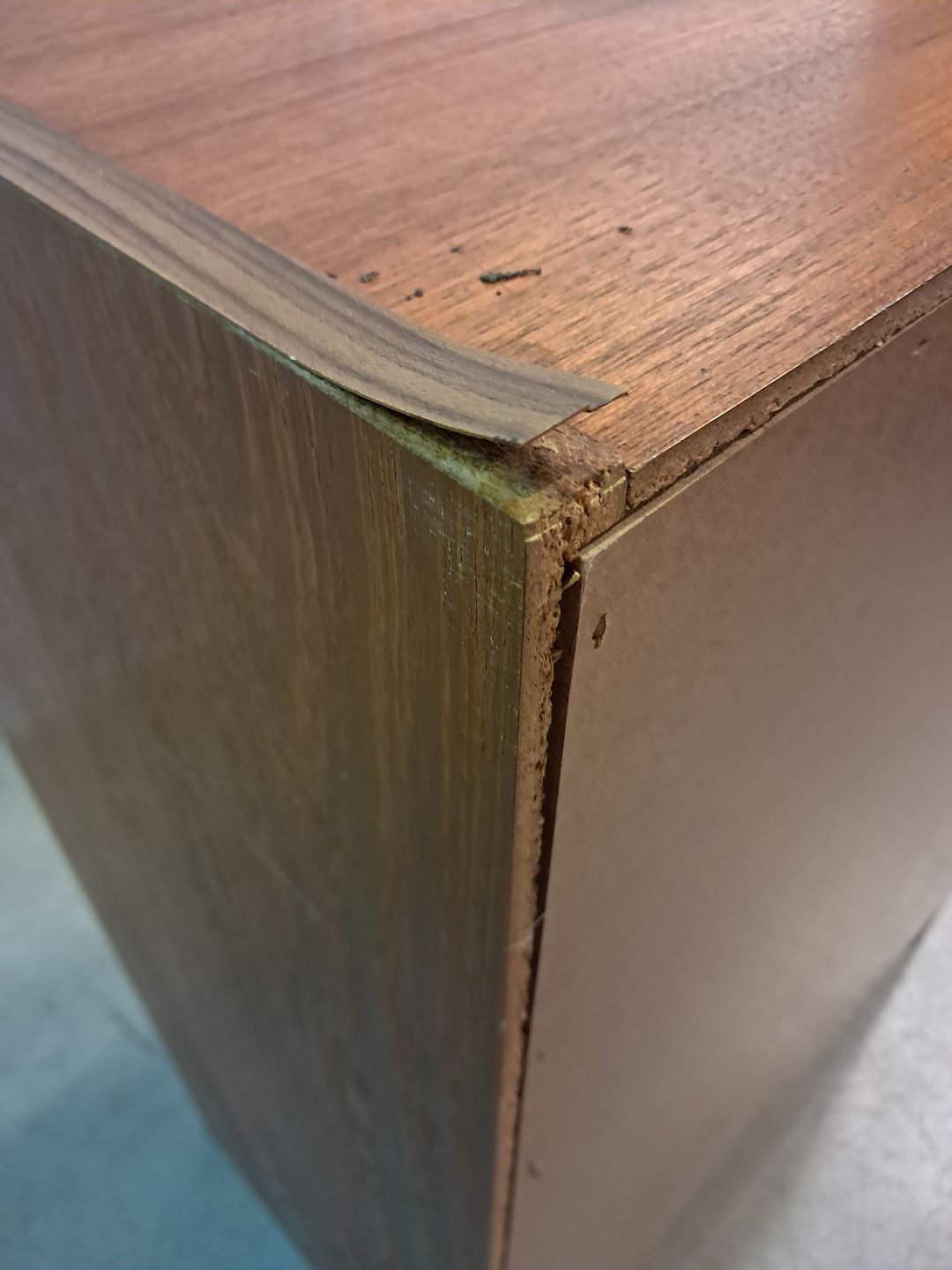 Kommode i fineret teaktræ, fra 1960erne. Den har brugsspor og defekte plast kantlister/bånd. Højde 110cm Bredde 76cm Dybde 41cm Emne nummer: 77407