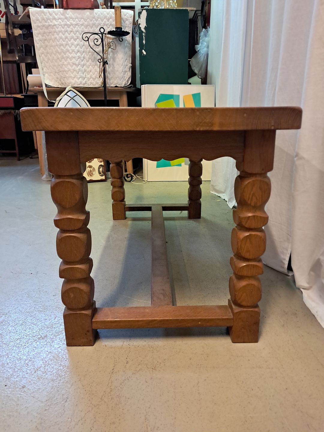 Sofabord i massivt egetræ, fra 1980erne. Det har brugsspor og et brændemærke. Højde 58cm Bredde 54cm Længde 120cm Plade tykkelse 4,5cm Emne nummer: 77408