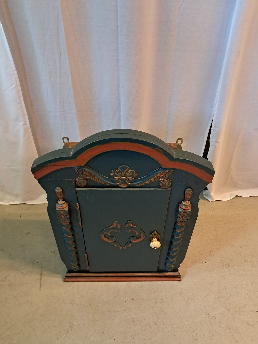 Malet hjørneskab fra 1940erne. Det har brugsspor. Højde 82cm Bredde 54cm Dybde 21cm Emne nummer: 77421