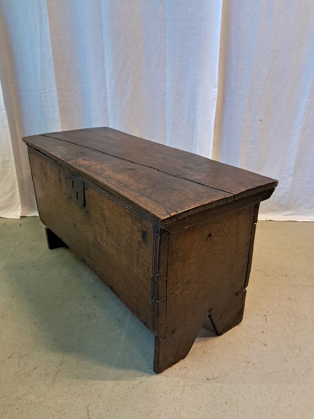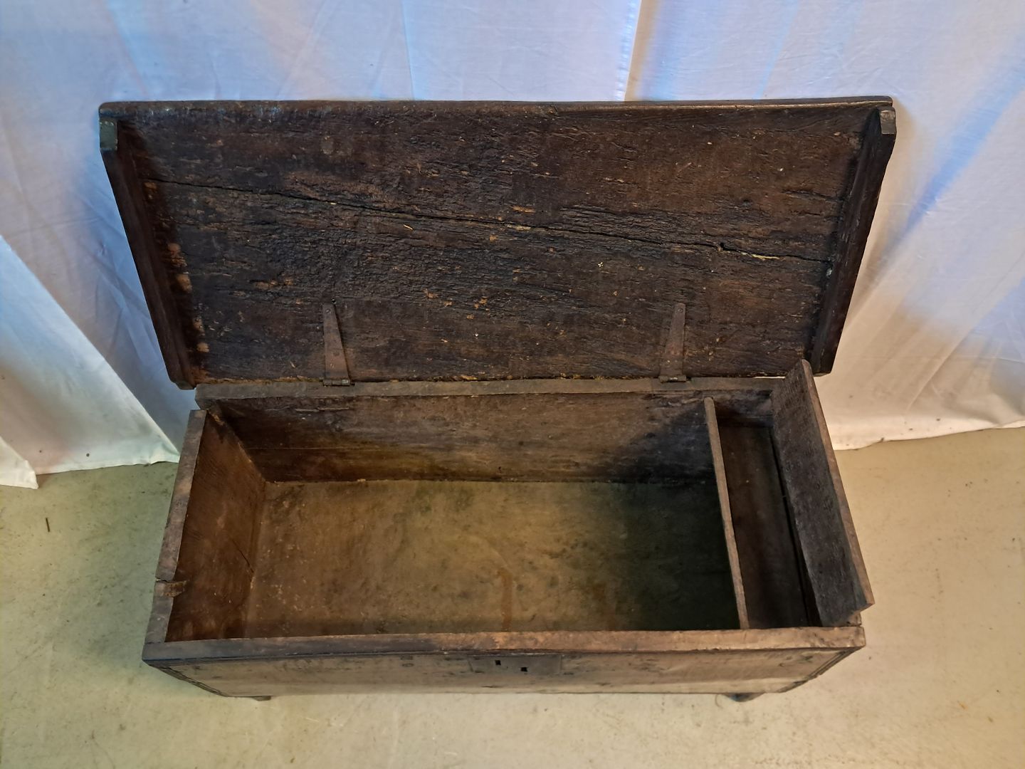 Kiste i massivt egetræ, fra 1850erne. Den har brugsspor, defekter og der medfølger ikke nøgle. Højde 45cm Bredde 80cm Dybde 35cm Emne nummer: 77453