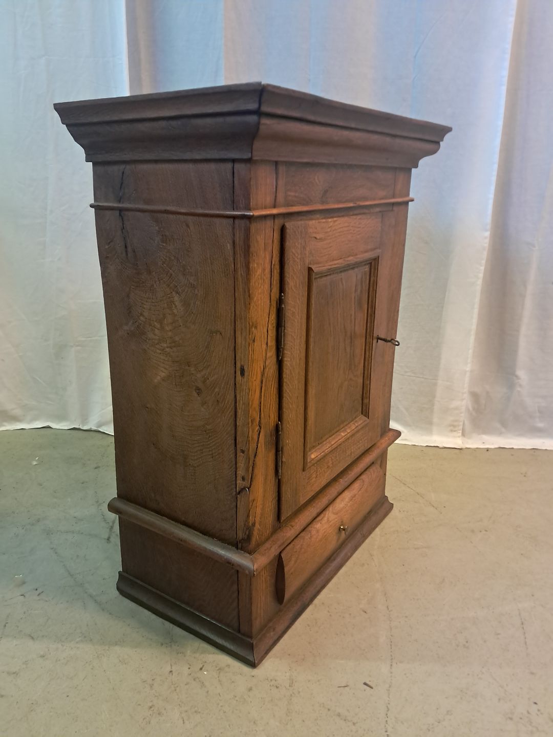 Vægskab i massivt egetræ, fra 1860erne. Det har brugsspor. Højde 81cm Bresse 62cm Dybde 33cm Emne nummer: 77460