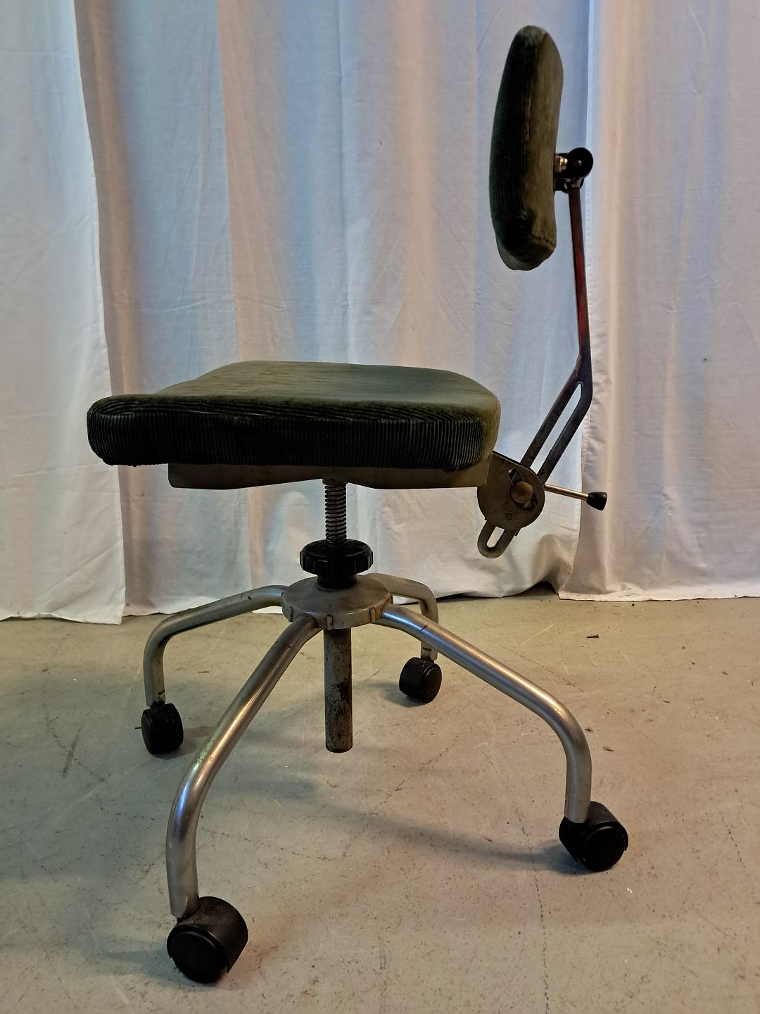 Kontorstol i metal med velourbetræk, fra 1960erne. Den har brugsspor. Ryghøjde 78cm Sædehøjde 47cm Emne nummer: 77470