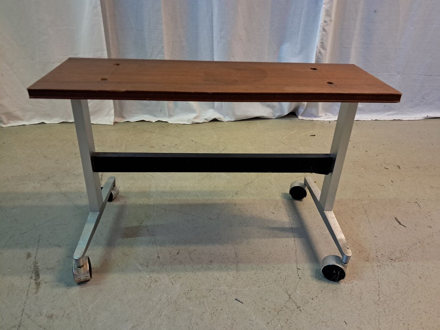 Bord i aluminium med fineret plade i teaktræ, fra 1980erne. Det har brugsspor. Højde 41cm Bredde 25cm Længde 61cm Emne nummer: 77471