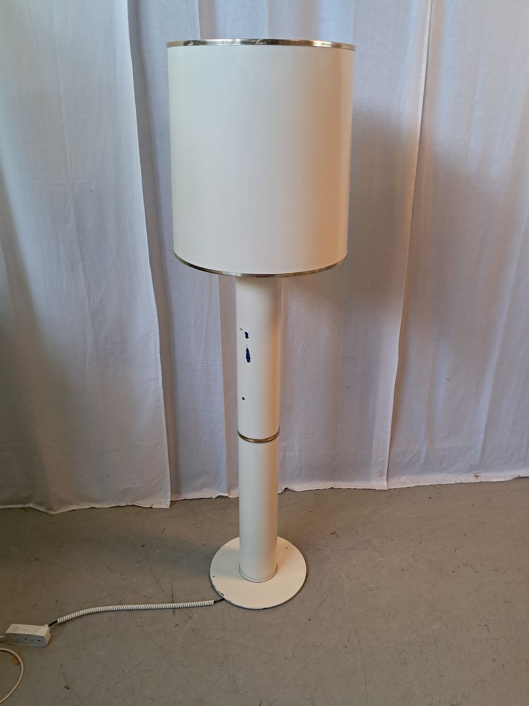 Standerlampe i metal og plast, fra 1980erne. Den har brugsspor. Højde 157cm Diameter på fod 33cm Diameter på skærm 45cm Emne nummer: 77512