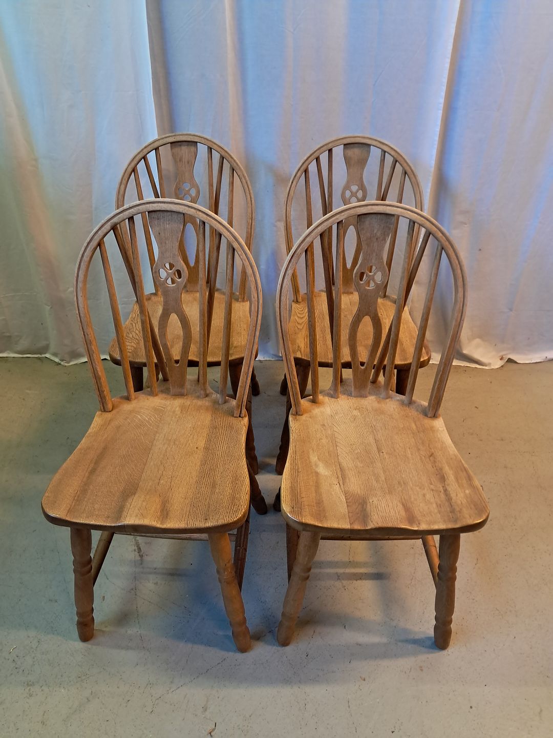 4 Winsor stole i massivt egetræ, fra 1970erne. De har brugsspor. Ryghøjde 91cm Sædehøjde 45cm Emne nummer: 77516