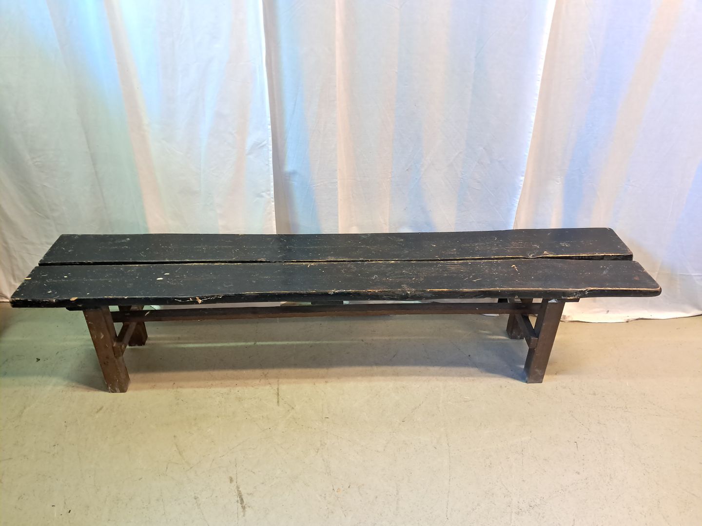 Malet bænk i massivt Fyrre og egetræ, fra 1950erne. Den har brugsspor. Højde 44cm Bredde 38cm Længde 195cm Emne nummer: 77527