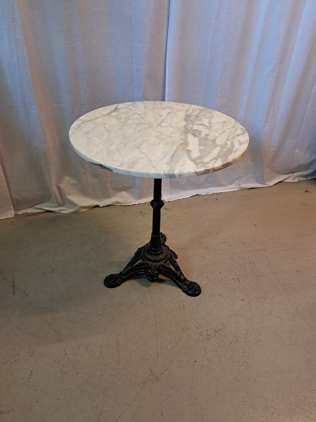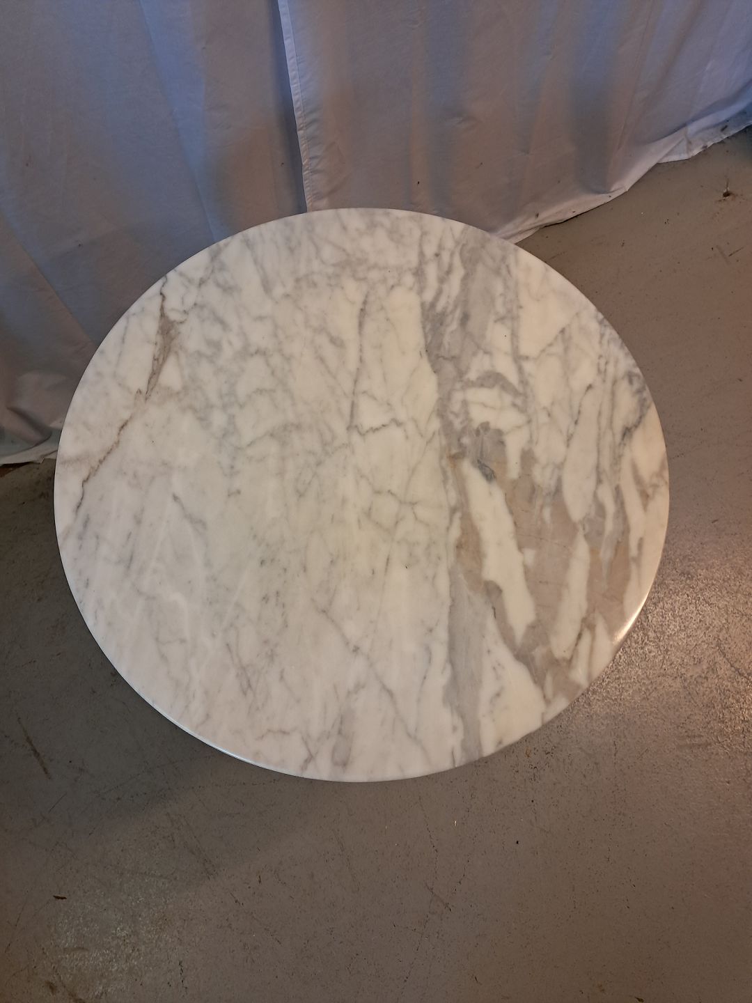 Bord i malet metal med marmorplade, fra 1990erne. Det har brugsspor. Højde 67cm Diameter 60cm Emne nummer: 77555