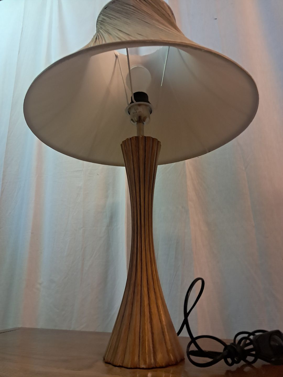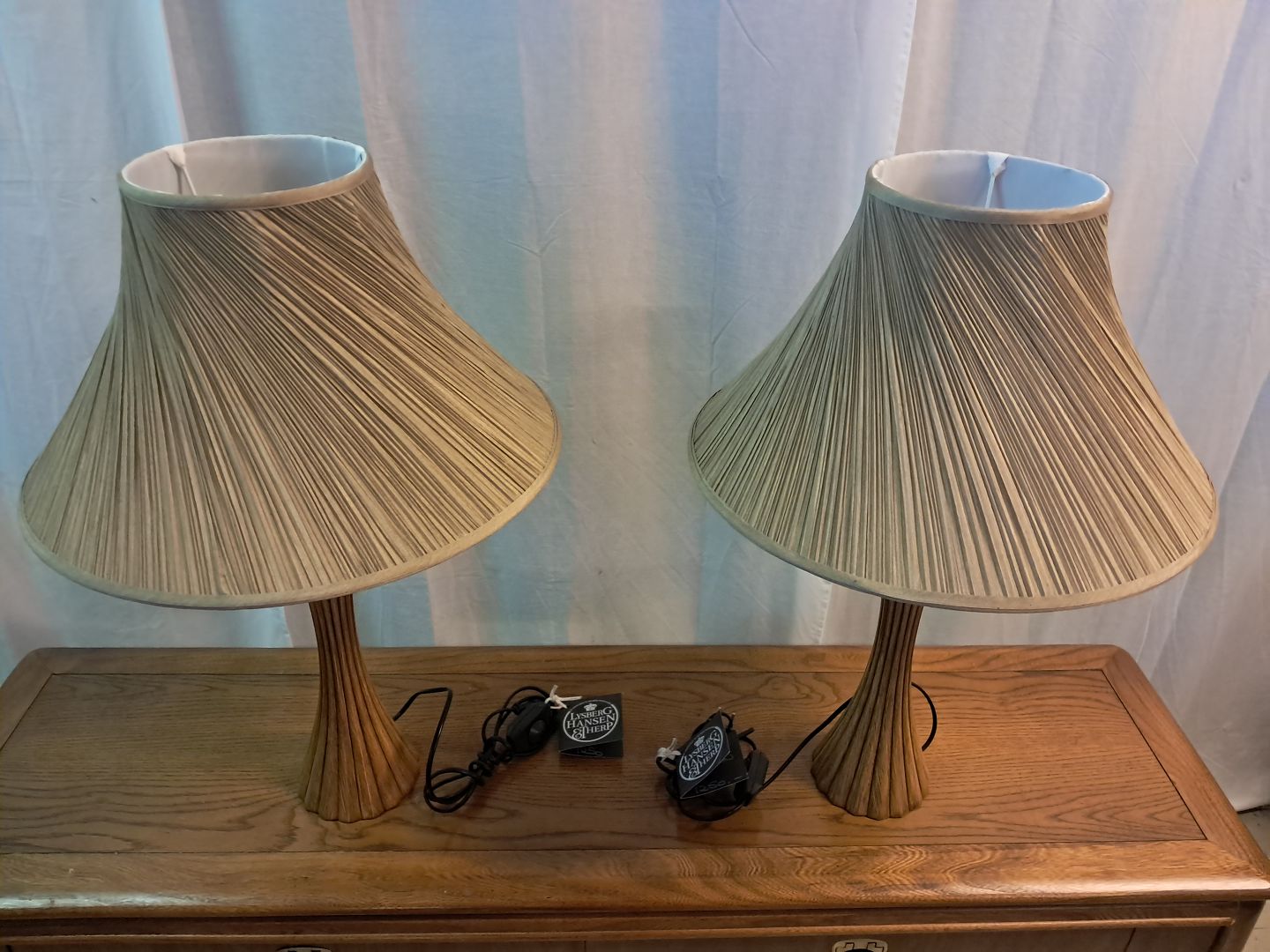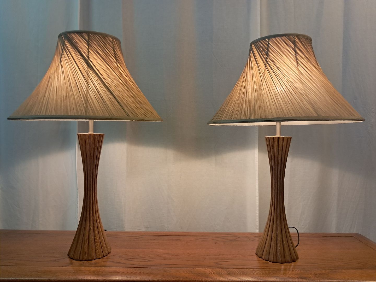 2 Lysberg Hansen og Therp bordlamper i pocelæn med skærme, fra 0erne. De har brugsspor. Højde 71cm Skærm diameter 48cm Emne nummer: 77568