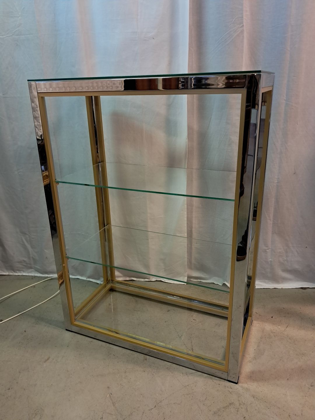 Forkromet reol i metal med glashylder, fra 1980erne. Den har brugsspor. Højde 105cm Bredde 76cm Dybde 37cm Se emne nr. 77573 og 77574 Emne nummer: 77572