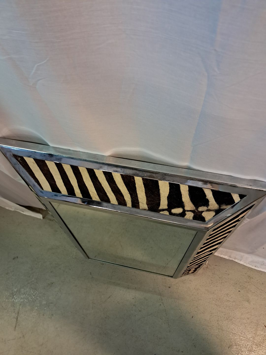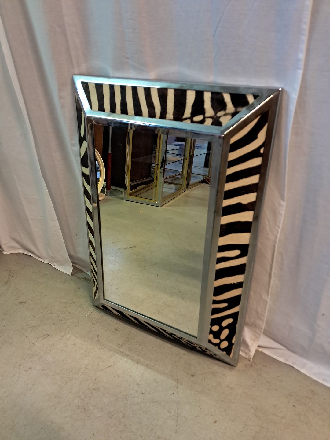 Spejl i metal og skind, fra 1990erne. Det har brugsspor. Højde 90cm Bredde 63cm Dybde 11cm Emne nummer: 77576