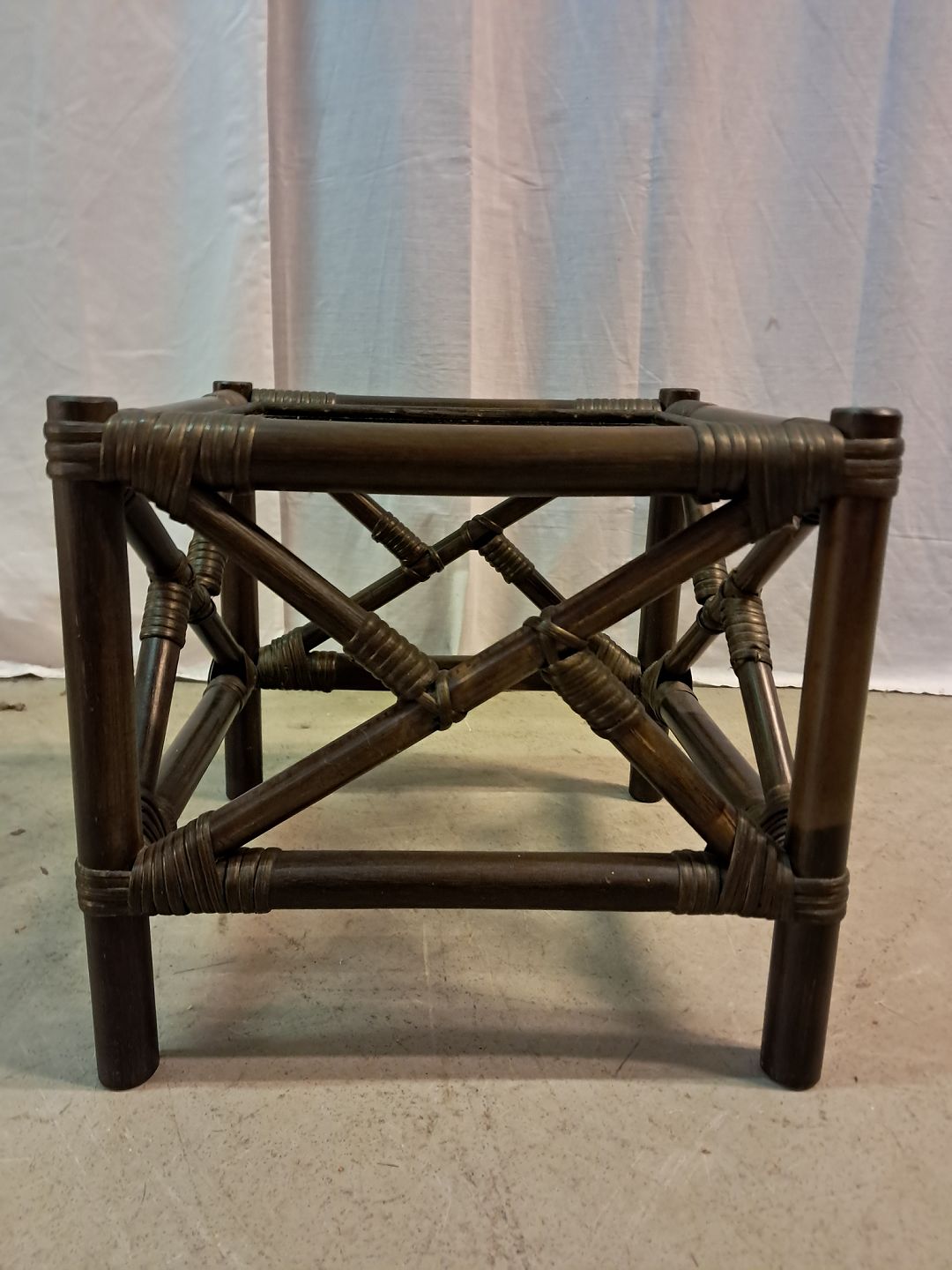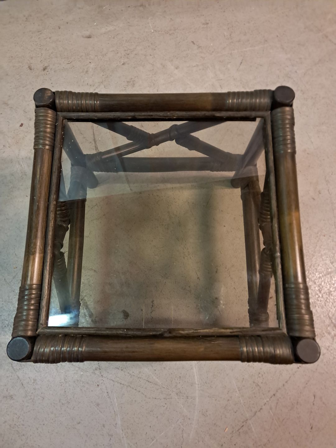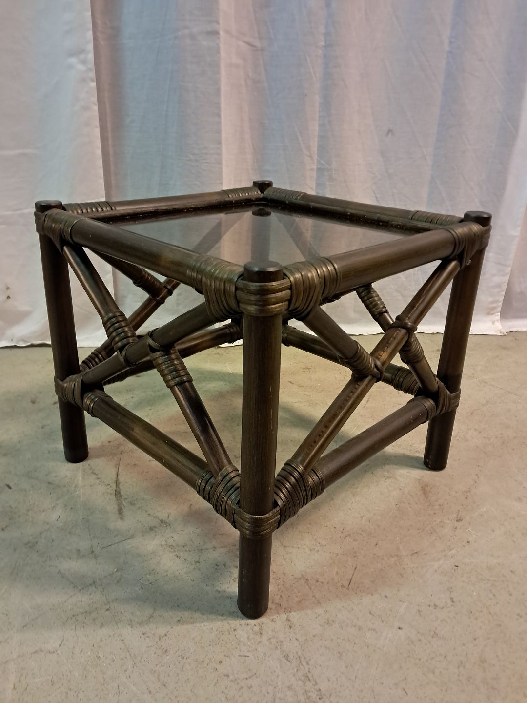 Lille bord i bambus med glasplade, fra 2000erne. Det har brugsspor. Højde 36cm Bredde 40cm Længde 40cm Emne nummer: 77591