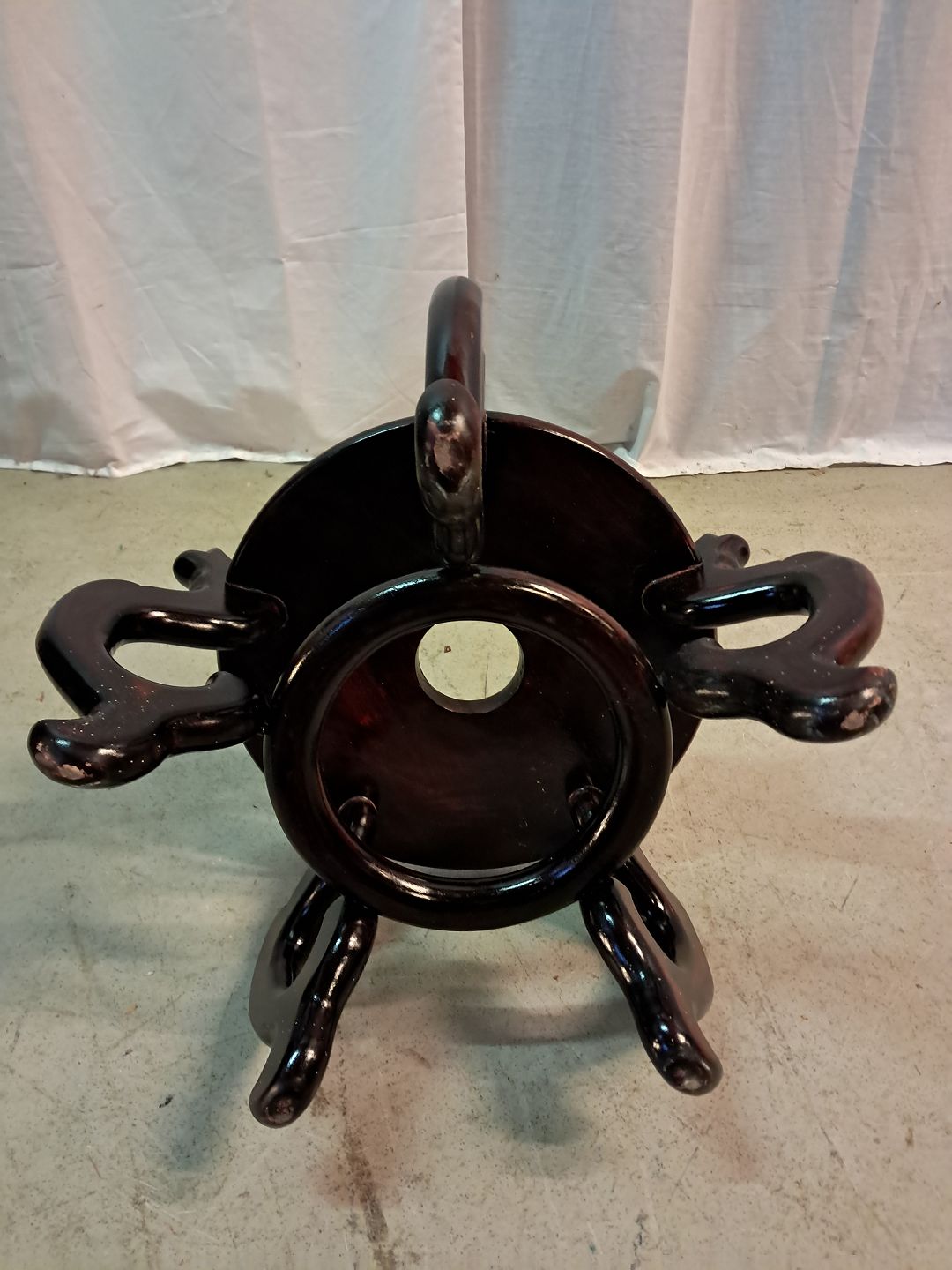 Asiatisk opsats i massivt træ, fra 1990erne. Den har brugsspor. Højde 30cm Diameter 46cm Pladediameter 29,5cm Emne nummer: 77594