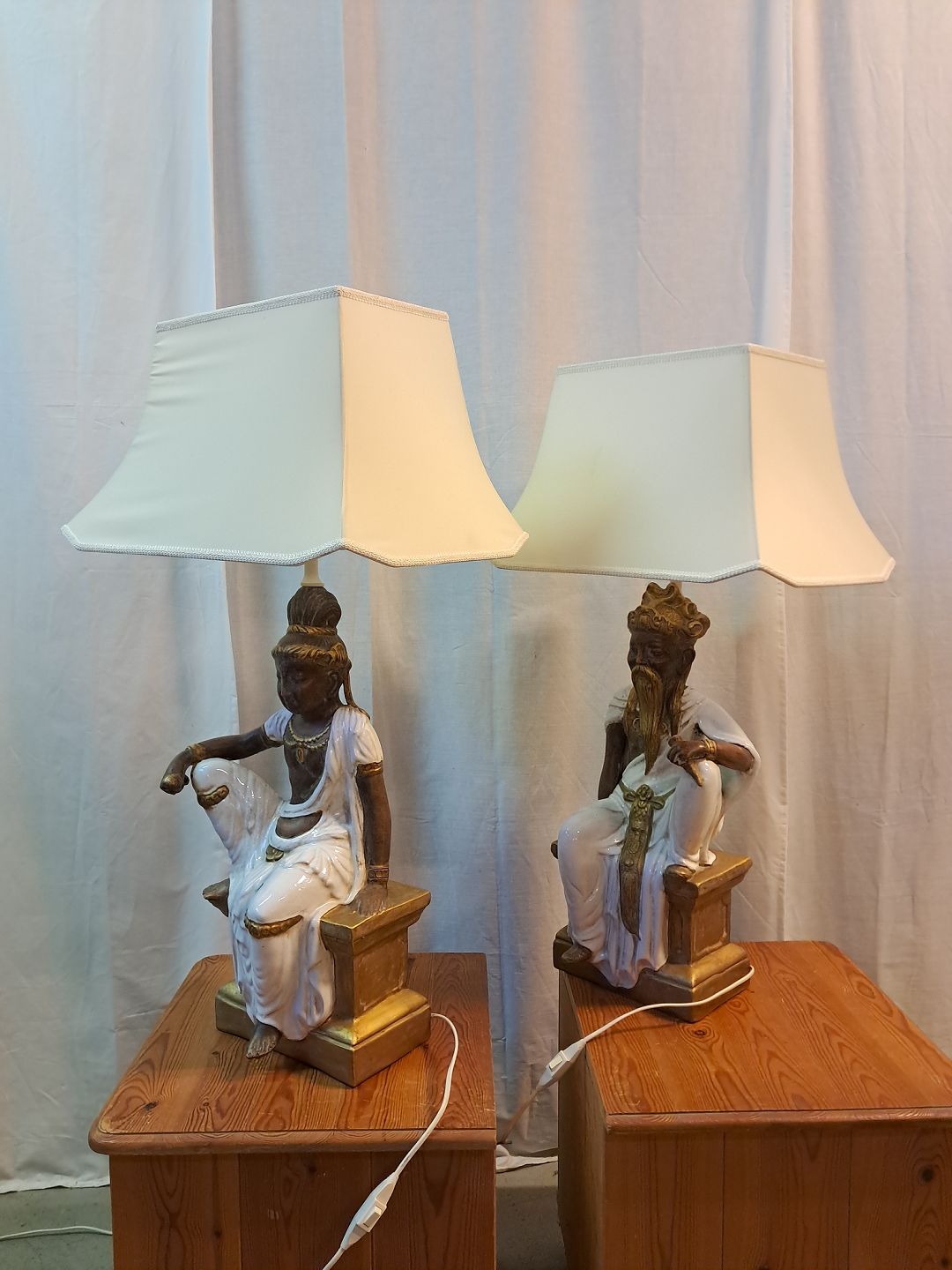 2 Bordlamper i pocelæn med skærme, fra 2000erne. Højde 83cm Skærmbredde 44cm Skærmdybde 33cm Emne nummer: 77604