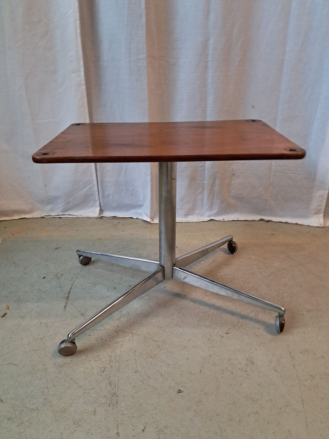 Bord i metal med massivt træplade, fra 1960erne. Det har brugsspor. Højde 44cm Bredde 34cm Længde 51cm Emne nummer: 77651