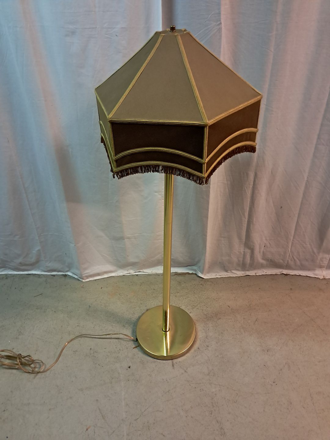 Gulvlampe i metal med lampeskærm, fra 1990erne. Den har brugsspor. Højde 127cm Diameter på fod 26cm Diameter på skærm 50cm Emne nummer: 77658