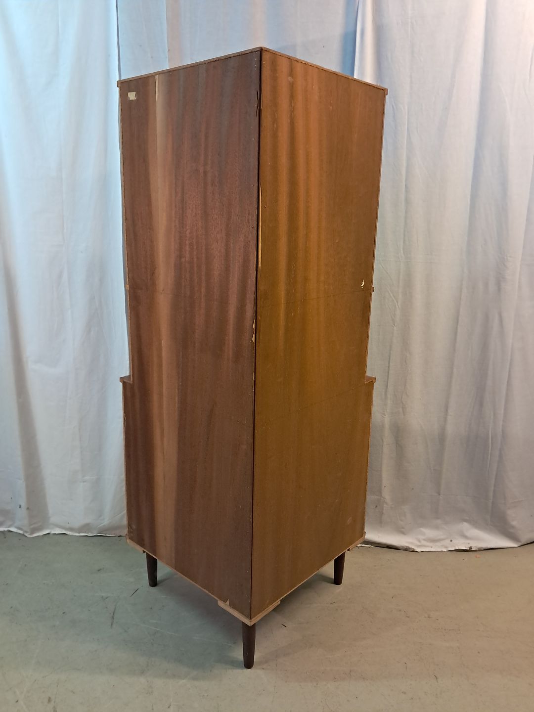 Hjørneskab i fineret teaktræ, fra 1960erne. Det har brugsspor. Højde 171cm Bredde 88cm Dybde 62cm Emne nummer: 77675