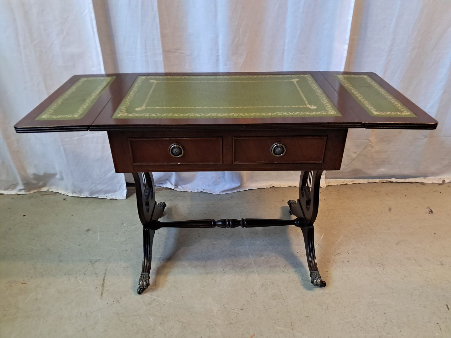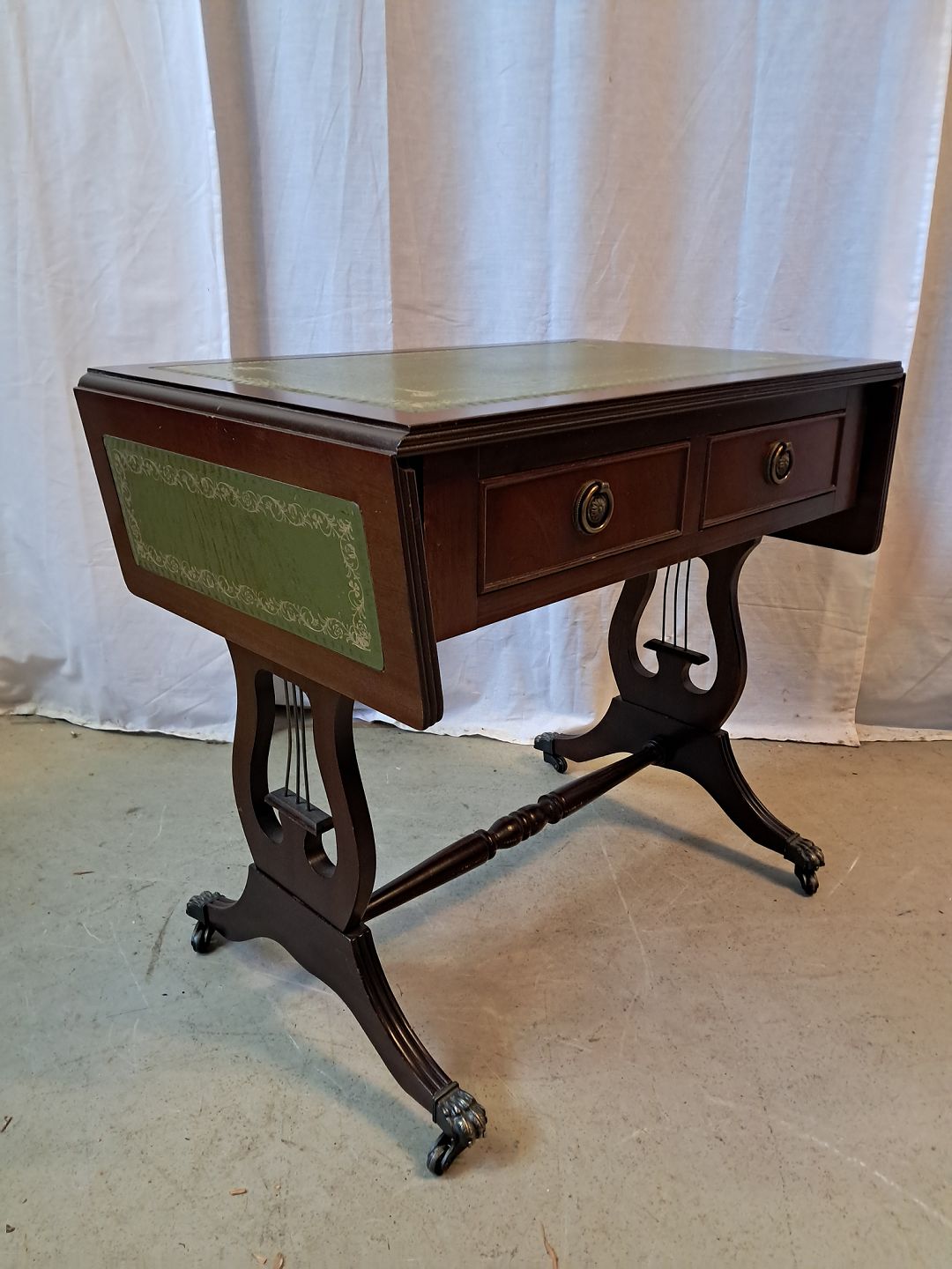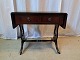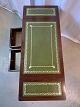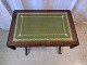 Sofabord i fineret mahogni med læderindlæg, fra 1980erne. Det har brugsspor. Højde 56cm Bredde 39cm Længde 60cm Længde med klapper 96cm Emne nummer: 77716