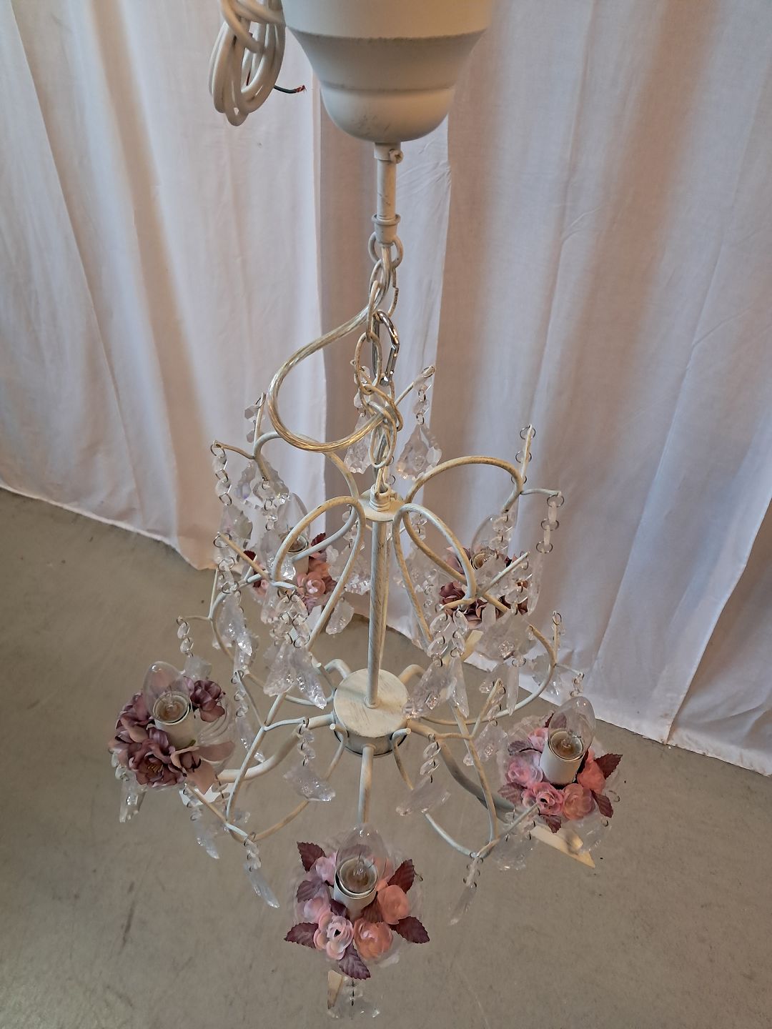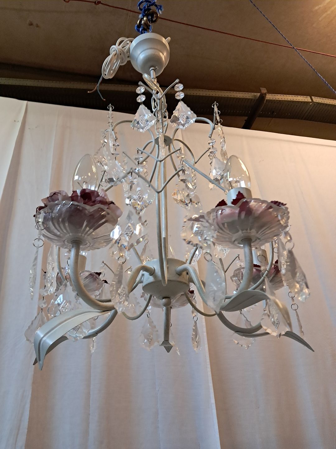 Malet lysekrone i metal med plastprismer, fra 1990erne.