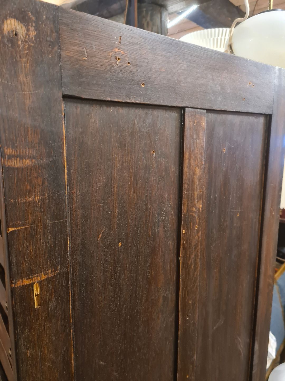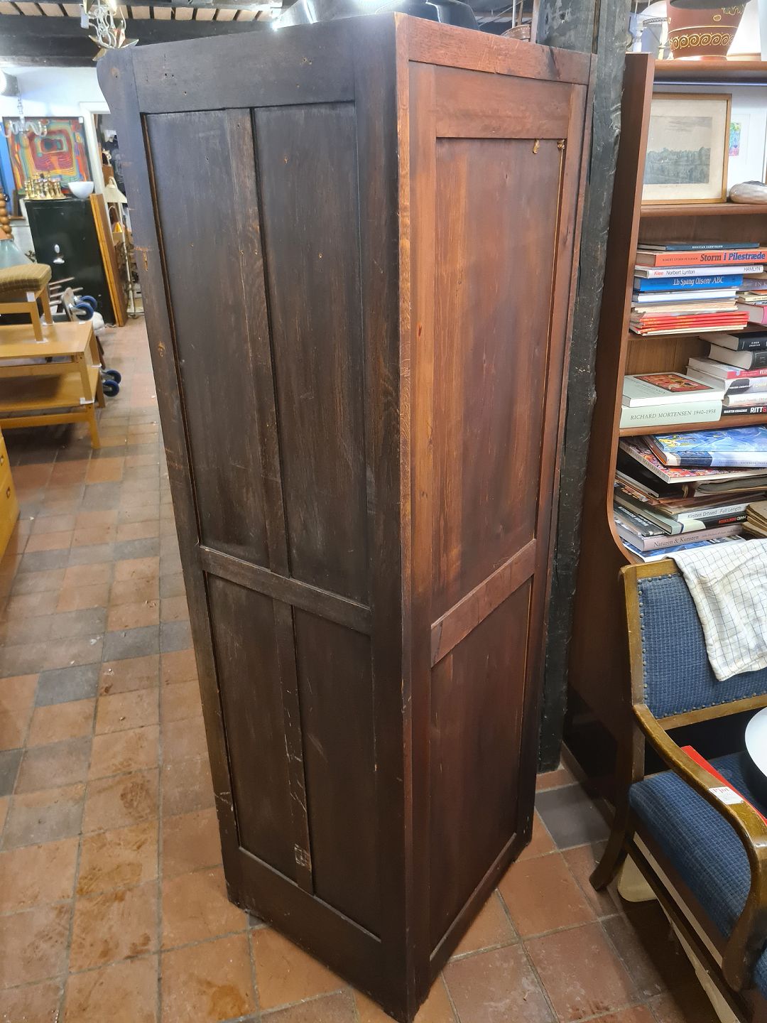 Ældre arkivskab m. jalousilåge, udført i mørk bejdset egetræ. Fremstillet i Danmark ca. år 1920. Fremstår i brugt stand, mindre huller i siden. Se foto. Semi defekt lås. Mål: H. 181 cm. B. 59 cm. D. 56 cm. Emne nummer: 81018