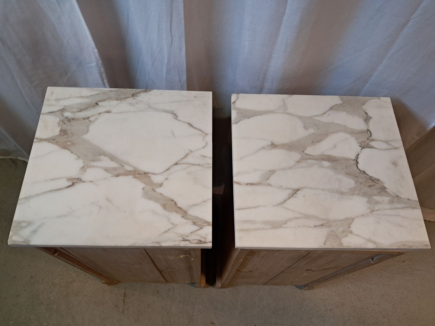 2 Natskabe i massivt fyrretræ med marmorplade, fra 1910erne. De har brugsspor. Højde 76cm Bredde 38cm Dybde 36cm Emne nummer: 77847